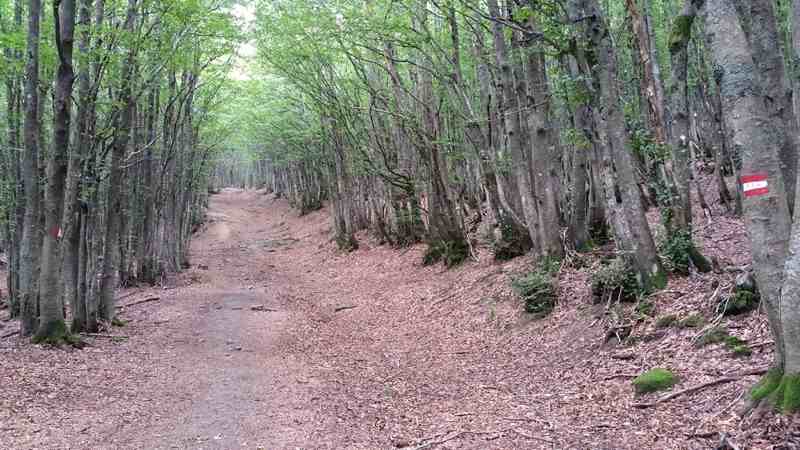 Ore 12:50: meglio ripartire! Il percorso che segue è molto bello, fra sentieri e strade sterrate. L'acqua (dal cielo) è arrivata ed ho continuato con la cerata. Niente di ché. Probabilmente è stata la mia fortuna perché adesso l'aria è fresca (potrebbero venirmi dei pensieri..) e riesco a camminare con assai meno sforzo. Arrivo così al monte delle forche dove si prende a sinistra e si fanno circa 200 metri nella strada asfaltata, che, seppur con poco traffico, rappresenta sempre il massimo pericolo per chi cammina (altro che lupi!). Ci si immette sulla destra in una strada forestale ben tenuta, con una sbarra, con l'indicazione per un monumento partigiano.